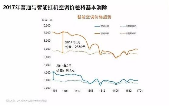 中國(guó)空調(diào)行業(yè)已加速向互聯(lián)網(wǎng)轉(zhuǎn)型 2014年,中國(guó)普通掛機(jī)空調(diào)與智能掛機(jī)空調(diào)價(jià)差近千元,柜機(jī)價(jià)差更是超過2500元,而到2017年價(jià)差已經(jīng)基本消除。