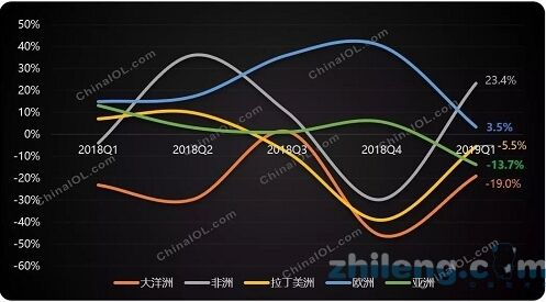 從分季度的各洲別出口增長率情況來看,2019年一季度僅有非洲和歐洲有不同幅度的增長。不過因為非洲這幾年的出口表現(xiàn)一直不太穩(wěn)定,整體規(guī)模較高峰期出現(xiàn)較大萎縮,而且在全球市場中所占份額較小,不足以影響整體出口趨勢。歐洲這兩年一直保持了較高的增長,但今年一季度的市場增長也出現(xiàn)疲軟,整體增速大幅收窄。