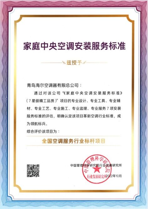 為了給用戶帶來高品質(zhì)空氣體驗(yàn),海爾中央空調(diào)牽頭發(fā)布了行業(yè)首個(gè)《家庭中央空調(diào)安裝服務(wù)標(biāo)準(zhǔn)》。同時(shí),海爾中央空調(diào)還升級(jí)了“7星級(jí)精工品質(zhì)”,對(duì)行業(yè)中央空調(diào)安裝服務(wù)做出了規(guī)范,填補(bǔ)了行業(yè)在該領(lǐng)域的空白。