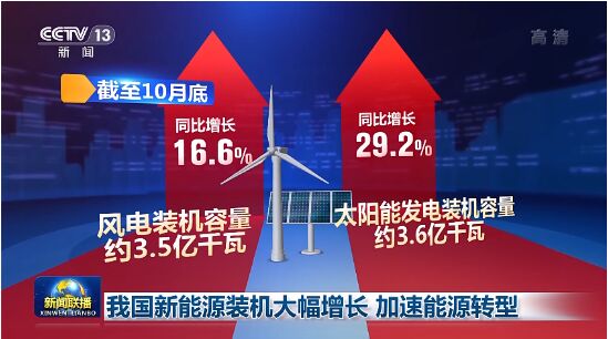 截至10月底,全國累計發(fā)電裝機容量約25億千瓦,同比增長8.3%。其中,風電、太陽能發(fā)電裝機容量分別約3.5億千瓦和3.6億千瓦,分別同比增長16.6%和29.2%,保持快速增長。