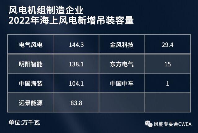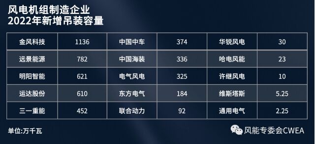 2022年,中國新增吊裝容量前五的風(fēng)電機(jī)組制造企業(yè)是金風(fēng)科技、遠(yuǎn)景能源、明陽智能、運(yùn)達(dá)股份、三一重能,其新增裝機(jī)容量分別為1136萬千瓦、782萬千瓦、621萬千瓦、610萬千瓦、452萬千瓦。