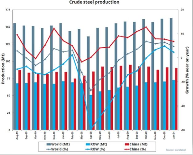 世界鋼鐵協(xié)會(huì)最新數(shù)據(jù)顯示,1月份,全球64個(gè)被納入世界鋼鐵協(xié)會(huì)統(tǒng)計(jì)國(guó)家的粗鋼產(chǎn)量為1.629億噸,同比提高4.8%。 其中,非洲地區(qū)粗鋼產(chǎn)量為120萬噸,同比下降7.9%;亞洲和大洋洲地區(qū)粗鋼產(chǎn)量為1.19億噸,同比提高6.3%;獨(dú)聯(lián)體地區(qū)粗鋼產(chǎn)量為920萬噸,同比提高4.5%;歐盟地區(qū)粗鋼產(chǎn)量為1220萬噸,同比下降0.4%;歐洲其他國(guó)家粗鋼產(chǎn)量為440萬噸,同比提高11.2%;中東地區(qū)粗鋼產(chǎn)量為360萬噸,同比提高1.5%;北美地區(qū)粗鋼產(chǎn)量為960萬噸,同比下降7%;南美地區(qū)粗鋼產(chǎn)量為380萬噸,同比提高11.4%。