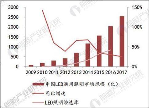 據前瞻產業(yè)研究院發(fā)布的《LED照明產業(yè)市場前瞻與投資戰(zhàn)略規(guī)劃分析報告》數據顯示,中國LED照明行業(yè)規(guī)模從78億元擴張超過2550億元,09-17年CAGR高達54.62%,LED通用照明市場的快速擴張,主因是通用照明行業(yè)的擴張與LED照明滲透率的提升,LED照明滲透率由2010年的0.6%升至2016年的42%。我們認為受益于LED燈的政策扶持和節(jié)能需求提升,LED對傳統(tǒng)燈源的替代效應有望持續(xù)釋放,LED滲透率仍將繼續(xù)提升,推動LED通用照明行業(yè)保持快速增長。