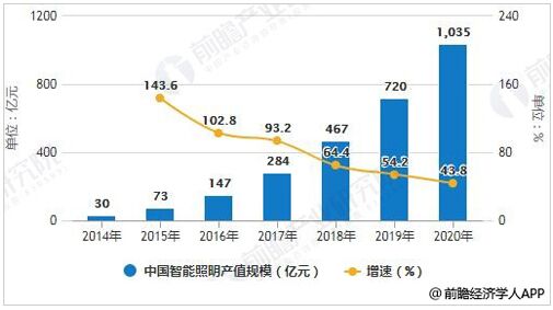 2014-2020年中國智能照明產(chǎn)值規(guī)模統(tǒng)計(jì)及增長情況預(yù)測