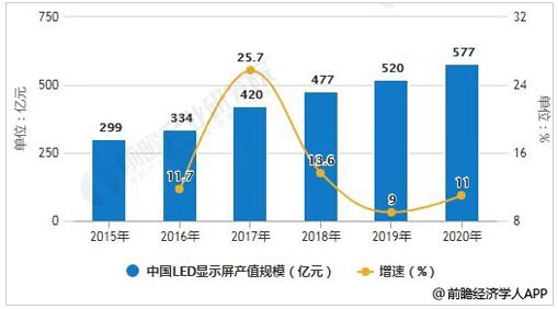 2015-2020年中國LED顯示屏產(chǎn)值規(guī)模統(tǒng)計(jì)及增長情況預(yù)測