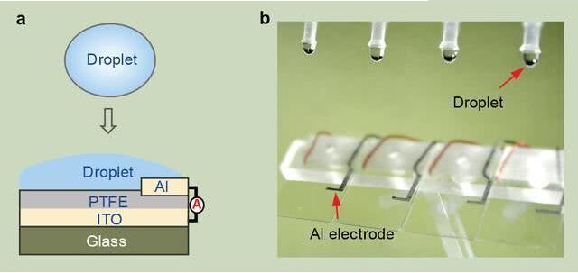 圖a是基于液滴的發(fā)電機(jī)(DEG)的示意圖。圖b是在玻璃基板上制造的四個(gè)平行的DEG器件的光學(xué)圖像。 香港城市大學(xué)/自然 圖