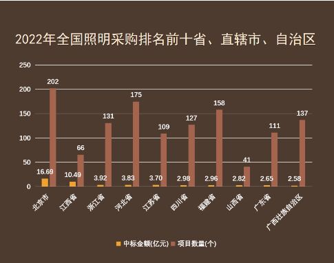 從采購項目數(shù)量來看,北京市照明采購依然位居榜首,其采購項目多集中在道路交通照明、教室照明和景觀照明,項目數(shù)量分別是61個、55個和34個。其中,大項目多集中在道路交通照明,例如,東六環(huán)(京哈高速-潞苑北大街)改造工程機電和照明工程,中標金額4.92億元;北京工人體育場改造復(fù)建政府和社會資本合作(PPP)項目,中標金額1.39億元;青年西路等30條道路照明工程項目,中標金額5855.17萬元;信創(chuàng)園起步區(qū)泛光照明工程,中標金額3357.76萬元;2022年北京地鐵6號線一期車站公共照明LED節(jié)能改造合同能源管理項目,中標金額為2608.11萬元。