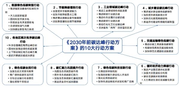《2030年前碳達(dá)峰行動(dòng)方案》中明確了碳達(dá)峰十大行動(dòng)方案:(一)能源綠色低碳轉(zhuǎn)型行動(dòng);(二)節(jié)能降碳增效行動(dòng);(三)工業(yè)領(lǐng)域碳達(dá)峰行動(dòng);(四)城鄉(xiāng)建設(shè)碳達(dá)峰行動(dòng);(五)交通運(yùn)輸綠色低碳行動(dòng);(六)循環(huán)經(jīng)濟(jì)助力降碳行動(dòng);(七)綠色低碳科技創(chuàng)新行動(dòng);(八)碳匯能力鞏固提升行動(dòng);(九)綠色低碳全民行動(dòng);(十)省(市、區(qū))碳達(dá)峰碳中和實(shí)施方案。
