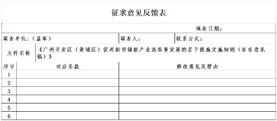 根據(jù)《廣州市黃埔區(qū)工業(yè)和信息化局、廣州市黃埔區(qū)發(fā)展和改革局關(guān)于印發(fā)廣州開發(fā)區(qū)(黃埔區(qū))促進(jìn)新型儲(chǔ)能產(chǎn)業(yè)高質(zhì)量發(fā)展的若干措施的通知》(穗埔工信規(guī)字〔2023〕4號(hào)),為便于政策實(shí)施,明確相關(guān)條款具體內(nèi)容及操作規(guī)范,結(jié)合本區(qū)實(shí)際,區(qū)工業(yè)和信息化局起草了《廣州開發(fā)區(qū)(黃埔區(qū))促進(jìn)新型儲(chǔ)能產(chǎn)業(yè)高質(zhì)量發(fā)展的若干措施實(shí)施細(xì)則(征求意見稿)》(附件1),F(xiàn)依據(jù)《廣州市黃埔區(qū)、廣州開發(fā)區(qū)行政規(guī)范性文件管理辦法》(穗埔府規(guī)〔2021〕1號(hào))有關(guān)規(guī)定,公開向社會(huì)征求意見,征求意見時(shí)間為2023年9月5日至2023年9月15日。如有意見請(qǐng)?zhí)顚憽墩髑笠庖姺答伇怼罚ǜ郊?)并發(fā)送至郵箱wangfeiyang@hp.gov.cn,聯(lián)系人:王飛陽,聯(lián)系電話:82113595。