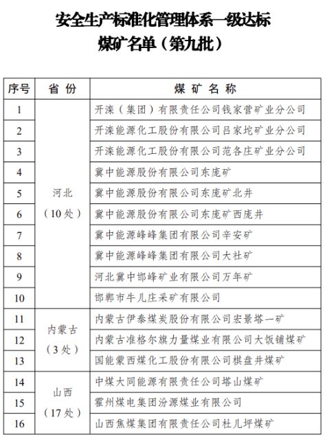 53處!國(guó)家公布安全生產(chǎn)標(biāo)準(zhǔn)化管理體系一級(jí)達(dá)標(biāo)煤礦名單