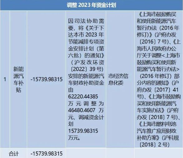 1、因司法協(xié)助需要,將《關(guān)于下達(dá)本市2023年節(jié)能減排專項資金安排計劃(第六批)的通知》(滬發(fā)改環(huán)資〔2022〕39號)安排的新能源汽車財政補助資金由62220.44385萬元調(diào)整為46480.4607萬元,調(diào)減資金計劃15739.98315萬元。