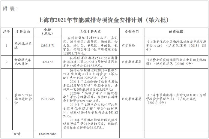 你們報來的資金使用計劃申請函(滬水務〔2021〕723號)及有關材料已收悉。經(jīng)研究,現(xiàn)將資金安排計劃下達給你們,共3項,計劃下達節(jié)能減排專項資金134659.5665萬元(詳見附表)。有關事項通知如下:
