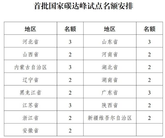 統(tǒng)籌考慮各地區(qū)碳排放總量及增長(zhǎng)趨勢(shì)、經(jīng)濟(jì)社會(huì)發(fā)展情況等因素,首批選取15個(gè)省區(qū)按照名額分配,建設(shè)35個(gè)碳達(dá)峰試點(diǎn)城市和試點(diǎn)園區(qū),具體名單由有關(guān)省區(qū)發(fā)展改革委提出,經(jīng)本地區(qū)人民政府同意后,于2023年11月15日前報(bào)國(guó)家發(fā)展改革委確認(rèn)。這15個(gè)省區(qū)從地域地理分布來看,有華北、華中、華東、西北、東北、東南,從沿海到內(nèi)陸,覆蓋了全國(guó)東西南北中各個(gè)方位;從區(qū)域經(jīng)濟(jì)結(jié)構(gòu)來看,既包擴(kuò)山東、江蘇、廣東等經(jīng)濟(jì)大省,也包括遼寧、河北、黑龍江等制造業(yè)占主導(dǎo)產(chǎn)業(yè)的省份,還包括山西、內(nèi)蒙古和新疆等傳統(tǒng)能源和新能源富集地區(qū)?梢钥闯,碳達(dá)峰試點(diǎn)地區(qū)的分配無(wú)論是從地理分布、產(chǎn)業(yè)布局還是能源結(jié)構(gòu),都統(tǒng)觀全局,兼顧均衡發(fā)展。