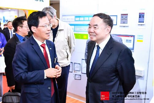 倍福中國(guó)區(qū)執(zhí)行董事、總經(jīng)理梁力強(qiáng)(左)陪同中國(guó)工程院院士、中國(guó)機(jī)械工程學(xué)會(huì)榮譽(yù)理事長(zhǎng)周濟(jì)(中)參觀倍福展臺(tái)
