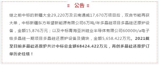 雙良節(jié)能的還原爐產(chǎn)品質(zhì)量、綜合指標(biāo)行業(yè)領(lǐng)先,根據(jù)之前公告的與云南通威、新疆大全的供貨合同,雙良節(jié)能將充分發(fā)揮在光伏多晶硅設(shè)備行業(yè)長期積累的深厚技術(shù)實(shí)力和領(lǐng)先的生產(chǎn)能力,為促進(jìn)全國節(jié)能光伏產(chǎn)業(yè)和碳中和目標(biāo)貢獻(xiàn)自己的“智造”力量。