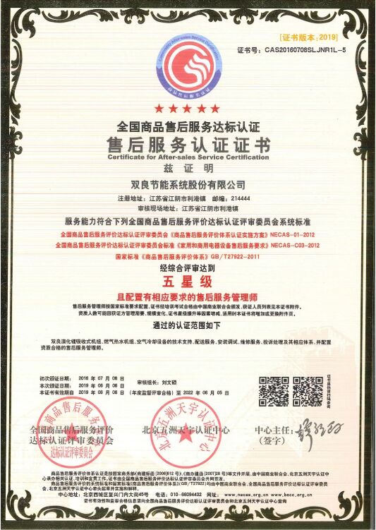BSCC權威認證:雙良節(jié)能雙良溴化鋰吸收式機組、燃氣熱水機組、空氣冷卻設備的售后服務符合CTEAS1001-2007《CTEAS售后服務體系完善程度認證評價規(guī)范》標準要求,具有完善的售后服務體系,綜合評審達到七星級(卓越)。 CTEAS七星級(卓越)售后服務認證是對企業(yè)售后服務體系完善程度評價的專業(yè)標準體系,在國家標準基礎上提出了更高要求,獲得證書的企業(yè)意味著不僅具有完善的售后服務體系,售后服務能力在國家處于一流水平,為目前最高的售后服務認證等級。
