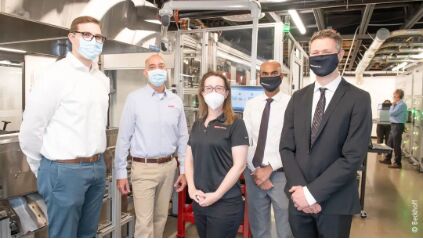 (左起)倍福團隊成員應用開發(fā)工程師 John Helfrich、區(qū)域銷售工程師 Charles Usher 和應用工程師 Lauren de Rosset 與 Glidewell 公司的自動化部經理 Kunal Patil 以及工程副總 David Leeson 密切合作