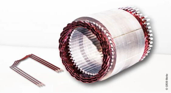 格勞博的點(diǎn)擊定子(右)包含多個(gè)由發(fā)卡式繞組組成的繞組輪轂(左)