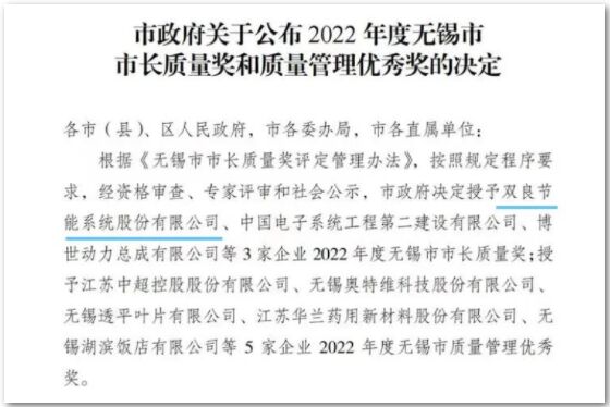 近日,無(wú)錫市人民政府發(fā)布《關(guān)于公布2022年度無(wú)錫市市長(zhǎng)質(zhì)量獎(jiǎng)和質(zhì)量管理優(yōu)秀獎(jiǎng)的決定》,雙良節(jié)能系統(tǒng)股份有限公司榜上有名,榮獲2022年度無(wú)錫市市長(zhǎng)質(zhì)量獎(jiǎng)。