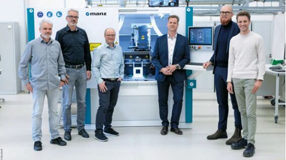 項(xiàng)目參與者在 BLS 500 前(從左到右):倍福銷售和系統(tǒng)咨詢工程師 Oliver Heilig,Manz 市場(chǎng)營(yíng)銷和企業(yè)傳播負(fù)責(zé)人 Axel Bartmann,Manz 軟件核心設(shè)計(jì)和產(chǎn)品開發(fā)主管 Stephan Lausterer,倍福汽車行業(yè)經(jīng)理 Jörg Rottkord 和 Tilman Plaß,以及 Manz 流程開發(fā)人員 Felix Röckel
