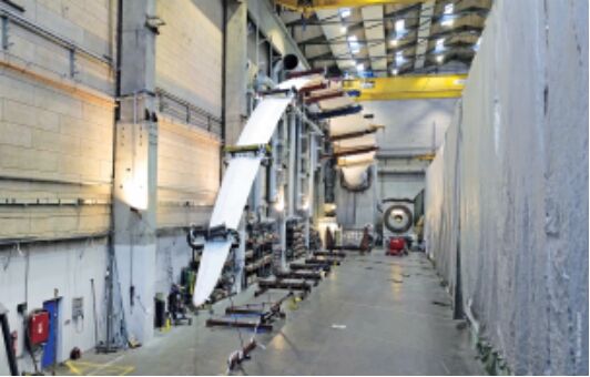 數(shù)百個(gè)應(yīng)變片用于測量牽引工位(在背景)啟動(dòng)的 100 米長的轉(zhuǎn)子葉片工作時(shí)產(chǎn)生的力和振動(dòng)。