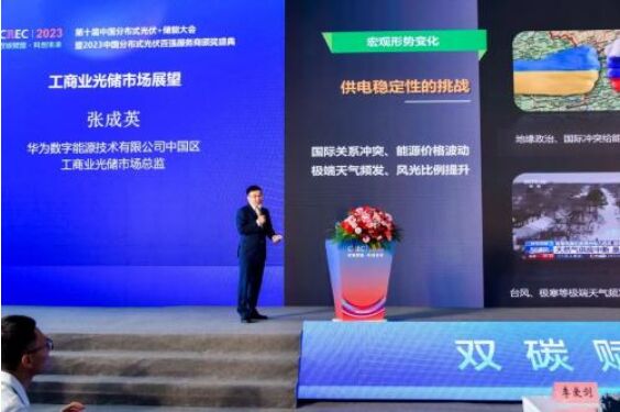 在第十屆中國分布式光伏+儲能論壇上,華為數(shù)字能源中國區(qū)智能光伏工商業(yè)光儲市場總監(jiān)張成英分享了《工商業(yè)光儲市場展望-光儲融合全面智能》,介紹了宏觀形勢、政策、市場熱點(diǎn)的變化,并對工商業(yè)光伏、儲能、光儲融合、BIPV等幾個場景的技術(shù)發(fā)展趨勢進(jìn)行了洞察。