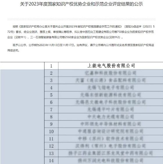 上能電氣榮登國家知識產(chǎn)權優(yōu)勢企業(yè)榜單