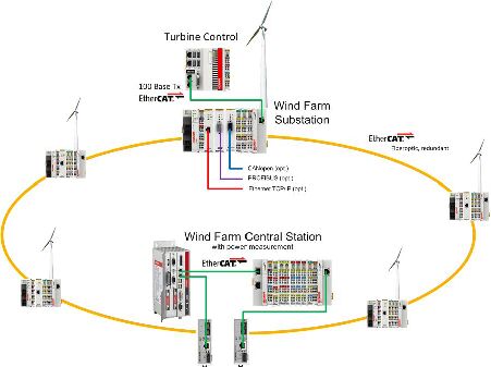 b) 風場的動態(tài)無功支撐能力 總裝機容量在百萬千瓦級規(guī)模及以上的風電群,當電力系統(tǒng)發(fā)生三相短路故障引起電壓跌落時,每個風電場在低電壓穿越過程中應具有以下動態(tài)無功支撐能力:當風電場并網點電壓處于標稱電壓的20%~90%區(qū)間內時,風電場應能夠通過注入無功電流支撐電壓恢復,所需的無功電流取決于電壓跌落的深度且必須取決于風力發(fā)電機組或電網并網點的要求;子并網點電壓跌落出現(xiàn)的時刻起,動態(tài)無功電流控制的響應時間不大于75ms,持續(xù)時間應不小于550ms。 1.2 現(xiàn)有風電場網絡存在的問題 現(xiàn)有風電場網絡存在的不足主要有兩個:①控制周期慢;②無法協(xié)調整個風電場內的風機達到風場級別LVRT功能。 現(xiàn)有的風電場網絡是基于以太網的解決方案,通訊采用以太網光纖,風機處使用普通以太網交換機,風場集控系統(tǒng)與各個風機之間采用TCP/IP等非實時的通訊協(xié)議。由于交換機的延時和以太網報文的不確定性,使得整個風電場控制網絡是“秒級”或者更長的時間,通訊速度和通訊的實時性無法保證。 現(xiàn)有風機的LVRT檢測和實現(xiàn)都是在風機本身的變流器部分實現(xiàn),根據(jù)要求新增的風力發(fā)電機組都必須具備低電壓穿越能力。然而,考慮到風場規(guī)模的增大,以及每臺風機的不同情況,根據(jù)單個風機監(jiān)測的電壓情況作出的反應也許不能產生電網營運商預期的效果。由于風力發(fā)電機組與電網并網點之間存在的阻抗,所以它們之間的電壓會有差異。也就是說各個風力發(fā)電機組對公共并網點電壓的變化會做出不同的反應。同樣,風力發(fā)電機組級饋入的無功電流與電網并網點的最終無功電流也是不一致的。即無法達到國家標準對整個風電場整體的低電壓穿越的要求。 1.3 EtherCAT風場控制網絡解決方案 永磁直驅風力發(fā)電機和雙饋異步風力發(fā)電機是目前使用最多的風力發(fā)電機類型,與傳統(tǒng)的恒速恒頻風力發(fā)電機相比,和功率因數(shù)可在+0.95到-0.95之間調整,可以在一定的范圍內調整輸出的有功和無功功率,其無功調節(jié)能力也廣泛地應用于風電場的無功調整。充分發(fā)揮風力發(fā)電機自身的無功支撐能力,并以遠端并網點母線電壓為控制目標,對維持電網的無功功率平衡和電壓穩(wěn)定有著十分重要的意義。來自德國弗勞恩霍夫風能及能源系統(tǒng)技術研究院的Melanie Hau 和Martin Shan [2]的研究表明,風場監(jiān)控網絡的速度以及風電機組自動控制系統(tǒng)現(xiàn)場總線的速度對風場電壓或無功功率控制可實現(xiàn)的動態(tài)性產生了顯著影響。 而這恰恰就是 EtherCAT 風場控制網絡解決方案的優(yōu)點。迄今為止,風場網絡監(jiān)控都是使用以太網實現(xiàn)的。以太網光纜用于將單獨的風力發(fā)電機組連接到主計算機。因為 EtherCAT 基于以太網,所以其與以太網的物理層完全兼容。當使用EtherCAT時,也可應用相同的物理層。此外,EtherCAT 還完全實現(xiàn)了線纜冗余。風場中的光纜環(huán)網通過風場主機的第二塊網卡形成閉環(huán)。亮點就在于,與目前使用的支持冗余的交換機相比,使用EtherCAT可以顯著提高傳輸速度并降低成本。 與目前的其它方案不同,EtherCAT 解決方案可以利用EtherCAT使整個風場應對低電壓穿越(LVRT)。因此,如果在風電場并網點診斷出有電壓跌落,它可以在1 ms的時間內將信號傳輸給整個風場的所有風力發(fā)電機組。且其能夠讓整個風場對電網中的電壓跌落做出協(xié)同的反應。這樣,解決方案即可實現(xiàn)整個風場在電網并網點的確定的行為。 另外,EtherCAT從站中的分布式時鐘能夠確保整個網絡中的數(shù)據(jù)采樣在時間上保持同步。時基誤差小于1μs(微秒),甚至小于100 納秒。有了這些數(shù)據(jù),電流、電壓和頻率可以得到相應控制且電網可以得到最優(yōu)的支持。 2.倍福極速風電場監(jiān)控網絡 倍福極速風電場監(jiān)控網絡方案如下圖2所示。 該方案是基于倍福的工業(yè)PC、電力測量端子模塊、帶光纖接口的EtherCAT耦合器和實時的EtherCAT通訊技術、超采樣技術、EtherCAT分布式時鐘技術。倍福工業(yè)PC上運行專用的風電場能量管理平臺,具有強大的風電場實時電力監(jiān)控功能。該平臺提供與電網調度接口,集中實時控制風電場并網點的電壓、功率等等。保證風電場與接入地區(qū)電網相互協(xié)調運行,實現(xiàn)高效的風電場運行和管理。EtheCAT光電轉換耦合器模塊把風電場管理平臺與風電場內的風機連接到一起,組成風電場實時電力監(jiān)控網絡,可在風電場網絡中實現(xiàn)小于 1 ms 的實時控制任務。專用的電力監(jiān)測端子模塊監(jiān)控風場電網并網點和單臺風機并網側的電網狀況(電壓、頻率、有功、無功等等)。
