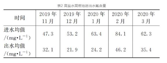 從實際運行數(shù)據(jù)可以看出,僅管氣化廢水水質(zhì)波動較大,但COD和氨氮處理效果相對較好,處理后出水氨氮最低可小于1mg/L。實際來水CN-和F-高于設計值,硬度低于設計值,這3個指標的變化均與煤種和配煤方案有較大的關系。CN-的生成與氣化溫度有關,中安氣化爐為粉煤氣化屬于高溫氣化工藝,氣化溫度>1 500℃,碳和氮在高溫下易發(fā)生反應,生成CN-。氣化污水CN-雖高于設計值,但小于10mg/L,如在進生化前采用氧化破氰預處理,氧化劑投加后不一定作用于氰根離子,大概率會與有機污染物反應?紤]到氰根離子未超過10mg/L,項目組采用提高生化系統(tǒng)氰根耐受性的方式處理氰根,通過逐步提高生化池進水CN-,適當加大生化池污泥回流量和硝化液回流量的方法馴化污泥,逐步提高系統(tǒng)對CN-的耐受性,經(jīng)過近3個月的馴化,二沉池出水CN-可穩(wěn)定小于0.5mg/L。氣化廢水中的F-主要與煤里氟的含量有關,由于運行煤種的變化造成F-來水超標,F(xiàn)-對蒸發(fā)結(jié)晶系統(tǒng)中的鈦材有一定的腐蝕性,考慮到中安廢水處理流程中并未設置單獨除F-設施,且由于現(xiàn)場占地緊張,無法新增除氟設施,只能利用現(xiàn)有除硬、除硅設施同步除氟。除氟、除硬、除硅的協(xié)同處理首先通過兩家研究單位實驗室研究反應機理,再通過現(xiàn)場調(diào)整操作運行解決。除氟、除硬、除硅最適宜的反應條件及pH均不同,通過實驗室和現(xiàn)場測定,適當調(diào)整反應pH、加藥量對除氟有一定的協(xié)同去除效應。現(xiàn)場根據(jù)研究結(jié)論摸索、調(diào)整運行操作,利用現(xiàn)有高鹽水除硬、除硅設施可同步達到30%~50%的除氟效率。系統(tǒng)中氟離子未完全去除,各段出水常年保有一定的氟離子含量,項目運行近2年來,后續(xù)蒸發(fā)結(jié)晶系統(tǒng)材料并未出現(xiàn)大面積腐蝕,在整個近零排放系統(tǒng)中F-的腐蝕性可控,見表2。