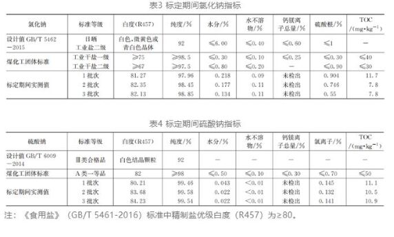蒸發(fā)結(jié)晶單元常見工藝有MVR+結(jié)晶器及多效蒸發(fā)結(jié)晶方案。MVR方案相對節(jié)能,蒸汽壓縮機轉(zhuǎn)速較高,對動、靜設備要求較高,MVR內(nèi)部結(jié)構(gòu)相對較復雜,設備結(jié)垢后不易清洗,一次投資較高;多效蒸發(fā)方案蒸汽消耗較大,設備內(nèi)部結(jié)構(gòu)簡單,易清洗,操作簡單。近零排放濃鹽水水質(zhì)復雜、易結(jié)垢堵塞,本項目地處淮河流域、環(huán)境敏感,如蒸發(fā)結(jié)晶系統(tǒng)不能長周期穩(wěn)定運行,一旦廢水無處去,將造成整個煤化工廠停產(chǎn)退料,同時考慮到石化企業(yè)低品質(zhì)蒸汽相對富裕,本項目最終采用了更穩(wěn)定易操作的多效蒸發(fā)方案作為蒸發(fā)結(jié)晶主工藝,在鹽側(cè)和硝側(cè)分別設置五效強制循環(huán)蒸發(fā)結(jié)晶系統(tǒng)。項目實際運行后,納濾分鹽產(chǎn)水側(cè)氯化鈉占主導,濃水測硫酸鈉占主導,蒸發(fā)結(jié)晶單元操作難度大幅降低,多效蒸發(fā)系統(tǒng)設備結(jié)構(gòu)簡單易操作,運行也更平穩(wěn)。中安項目自2019年底打通全流程產(chǎn)出合格硫酸鈉和氯化鈉以來穩(wěn)定運行至今,每年節(jié)省危廢處置費用約4 000萬。項目標定期間共檢測3批次氯化鈉、硫酸鈉,各項指標均優(yōu)于設計值。氯化鈉白度、水分、TOC、鈣鎂離子優(yōu)于煤化工團體標準一級工業(yè)干鹽標準,純度、水不溶物滿足二級工業(yè)干鹽標準硫酸根基本滿足二級工業(yè)干鹽標準。硫酸鈉3批次全部滿足煤化工團體標準A類一等品標準,見表3和表4。
