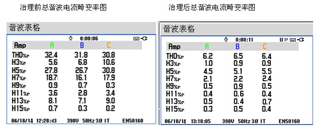 以下為西安某支行治理效果:ZAPF有源濾波器投入后,電流總畸變率從32.4%降低到6.2%,大大提高了電網(wǎng)的電能質量,濾波效果明顯。