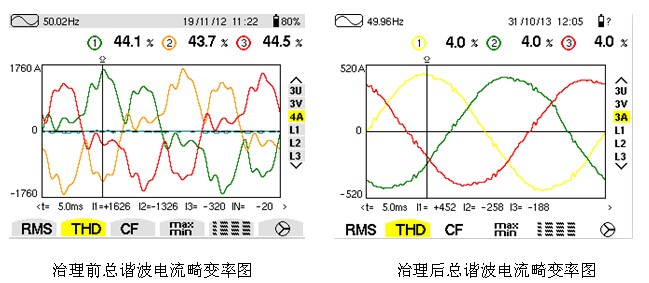 以下為貴陽(yáng)電信治理效果:ZAPF有源濾波器投入后,電流總畸變率從44.1%降低到4.0%,大大提高了電網(wǎng)的電能質(zhì)量,濾波效果非常明顯。