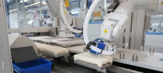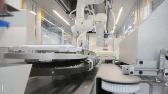 添加新的模塊后,這臺設(shè)備將來既能用散裝泡罩包裝組件,也能用帶紙板外包裝和已打印好的標(biāo)簽的泡罩包裝組件。這需要在設(shè)備中添加一個切紙裝置、一個用于紙箱坯料的料庫模塊和一個新的打印機(jī)模塊。紙盒包裝將于 2023 年夏天推出;在此之前,包裝將繼續(xù)采用散裝泡罩。Elos 還增加了兩個視覺模塊,用于檢查待包裝的物品以及標(biāo)簽的位置和內(nèi)容。在此之前,設(shè)備底座上安裝了兩個機(jī)器人。擴(kuò)展后,機(jī)器人可以在機(jī)器單元頂部的導(dǎo)軌上自由地來回移動,以騰出空間并執(zhí)行更多任務(wù)。