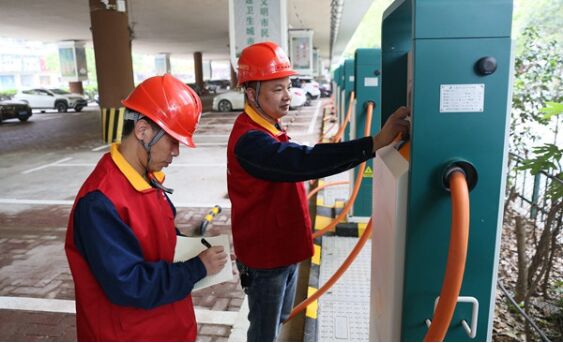 (國網(wǎng)邵陽供電公司共產(chǎn)黨員服務(wù)隊在步步高商場充電站進行日常維護作業(yè)。圖片由 星辰全媒體記者 賀亞玲 攝)
