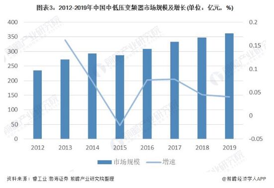 圖表3:2012-2019年中國(guó)中低壓變頻器市場(chǎng)規(guī)模及增長(zhǎng)(單位:億元,%)