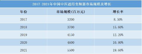 2021年作為“十四五”規(guī)劃的開局之年,雖然受能源雙控和環(huán)保高壓的影響,疊加汛情、疫情、臺(tái)風(fēng)、限電等因素影響,下游投資有所減緩,但全年宏觀政策跨周期調(diào)節(jié)扎實(shí)推進(jìn),中國經(jīng)濟(jì)持續(xù)穩(wěn)定恢復(fù),能源清潔低碳轉(zhuǎn)型深入推進(jìn),產(chǎn)業(yè)升級(jí)、結(jié)構(gòu)優(yōu)化持續(xù)發(fā)力,中高壓通用變頻器市場呈現(xiàn)高速增長。 2021年中國中高壓通用變頻器整體市場規(guī)模為 55億元,同比增長 19.6%。