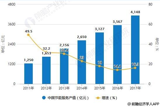 2011-2017年中國節(jié)能服務產(chǎn)值統(tǒng)計及增長情況