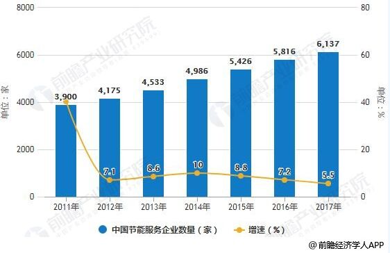 數(shù)據(jù)來源:前瞻產(chǎn)業(yè)研究院整理 2011-2017年中國節(jié)能服務企業(yè)數(shù)量統(tǒng)計及增長情況