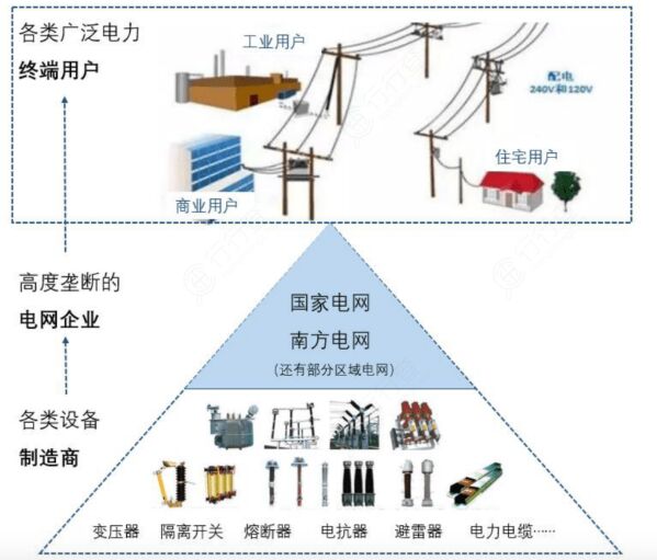 電網(wǎng)產(chǎn)業(yè)鏈下游是廣泛的終端用戶,電網(wǎng)企業(yè)提供輸送電服務,用戶向電網(wǎng)企業(yè)支付電費(目前電網(wǎng)企業(yè)仍然是最主要的售電主體),根據(jù)電價的差異,大致可以將用戶分為:大工業(yè)、一般工商業(yè)、居民以及農(nóng)業(yè)生產(chǎn)四類,其中大工業(yè)和一般工商業(yè)用戶對應的電價高于居民和農(nóng)業(yè)生產(chǎn)用電價。 中游是電網(wǎng)建設及運營,傳統(tǒng)模式下電網(wǎng)企業(yè)進行網(wǎng)架建設投資,通過購售電價差,收回投資及賺取收益。 電網(wǎng)的上游包括建設環(huán)節(jié)的設備企業(yè)和運營環(huán)節(jié)的發(fā)電企業(yè)。其中電力設備企業(yè)不僅有硬件設備,也包括軟件,系統(tǒng)集成等。