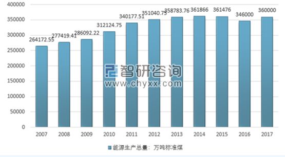 根據(jù)國家統(tǒng)計局初步計算,2017年我國能源生產(chǎn)總量達(dá)到360000萬噸標(biāo)準(zhǔn)媒,相比與2016年的34.6億噸增長了4.04%.