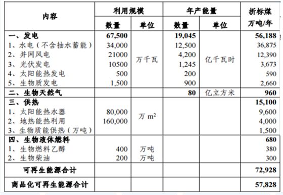 “十二五”期間,我國非化石能源和天然氣消費(fèi)比重分別提高2.6和1.9個百分點,煤炭消費(fèi)比重下降5.2個百分點,天然氣消費(fèi)比例大幅提升。清潔化步伐不斷加快。水電、風(fēng)電、光伏發(fā)電裝機(jī)規(guī)模和核 電在建規(guī)模均居世界第一。非化石能源發(fā)電裝機(jī)比例達(dá)到35%,新增非化石能源發(fā)電裝機(jī)規(guī)模占世界的40%左右,能源消費(fèi)結(jié)構(gòu)調(diào)整加速。 為實現(xiàn) 2020、2030 年非化石能源占一次能源消費(fèi)比重分別達(dá)到 15%、20%的能源發(fā)展戰(zhàn)略目標(biāo),進(jìn)一步促進(jìn)可再生能源開發(fā)利用,加快對化石能源的替代進(jìn)程,改善可再生能源經(jīng)濟(jì)性,提出主要指標(biāo)如下: 1、可再生能源總量指標(biāo)。到 2020 年,全部可再生能源年利用量 7.3 億噸標(biāo)準(zhǔn)煤。其中,商品化可再生能源利用量5.8 億噸標(biāo)準(zhǔn)煤。 2、可再生能源發(fā)電指標(biāo)。到 2020 年,全部可再生能源發(fā)電裝機(jī) 6.8 億千瓦,發(fā)電量 1.9 萬億千瓦時,占全部發(fā)電量的 27%。 3、可再生能源供熱和燃料利用指標(biāo)。到 2020 年,各類可再生能源供熱和民用燃料總計約替代化石能源 1.5 億噸標(biāo)準(zhǔn)煤。 4、可再生能源經(jīng)濟(jì)性指標(biāo)。到 2020 年,風(fēng)電項目電價可與當(dāng)?shù)厝济喊l(fā)電同平臺競爭,光伏項目電價可與電網(wǎng)銷售電價相當(dāng)。 5、可再生能源并網(wǎng)運(yùn)行和消納指標(biāo)。結(jié)合電力市場化改革,到 2020 年,基本解決水電棄水問題,限電地區(qū)的風(fēng)電、太陽能發(fā)電年度利用小時數(shù)全面達(dá)到全額保障性收購的要求。 6、可再生能源指標(biāo)考核約束機(jī)制指標(biāo)。建立各省(自治區(qū)、直轄市)一次能源消費(fèi)總量中可再生能源比重及全社會用電量中消納可再生能源電力比重的指標(biāo)管理體系。到2020 年,各發(fā)電企業(yè)的非水電可再生能源發(fā)電量與燃煤發(fā)電量的比重應(yīng)顯著提高。