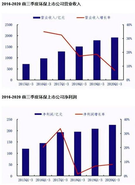 統(tǒng)計數(shù)據(jù)顯示,今年前三季度,我國環(huán)保相關(guān)上市公司營業(yè)收入同比增長7.1%,凈利潤同比增長8.1%。 生態(tài)環(huán)境部科技與財務(wù)司、中國環(huán)境保護產(chǎn)業(yè)協(xié)會日前聯(lián)合發(fā)布的《中國環(huán)保產(chǎn)業(yè)發(fā)展狀況報告(2020)》稱,2019年全國環(huán)保產(chǎn)業(yè)營業(yè)收入約17800億元,較2018年增長約11.3%。報告預(yù)測,2021年我國環(huán)保產(chǎn)業(yè)營業(yè)收入總額有望超過2萬億元,到2025年有望突破3萬億元。 來源:第一財經(jīng)