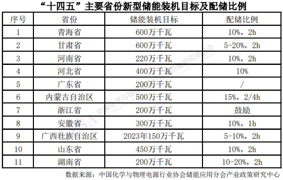 2021年7月,國家發(fā)展改革委、國家能源局聯(lián)合發(fā)布《關(guān)于加快推動新型儲能發(fā)展的指導(dǎo)意見》,到2025年,新型儲能裝機(jī)規(guī)模達(dá)3000萬千瓦以上。2022年3月,《“十四五”新型儲能發(fā)展實施方案》進(jìn)一步明確發(fā)展目標(biāo)和細(xì)化重點任務(wù)。為加快推進(jìn)新型儲能規(guī)模化應(yīng)用,推動新型儲能快速發(fā)展,全國多省市自治區(qū)陸續(xù)提出了“十四五”新型儲能裝機(jī)目標(biāo)。