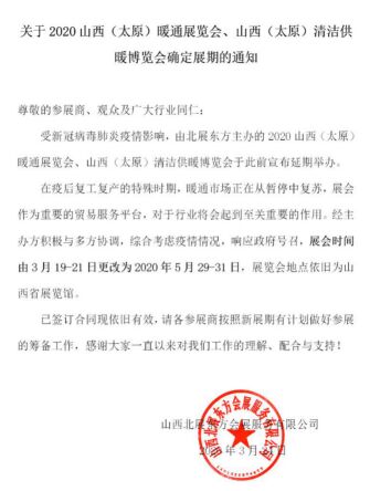根據(jù)新型肺炎疫情防控需要,為貫徹落實黨中央和山西省政府做好新型冠狀病毒感染的肺炎疫情防控工作,切實保障廣大參展商和觀眾及各界朋友們的健康安全,確保參展企業(yè)的參展效果和采購商的參觀體驗,原定于3月19-21日在山西舉辦的2020山西(太原)暖通展覽會延期至5月29-31日舉辦。