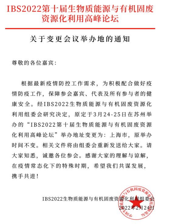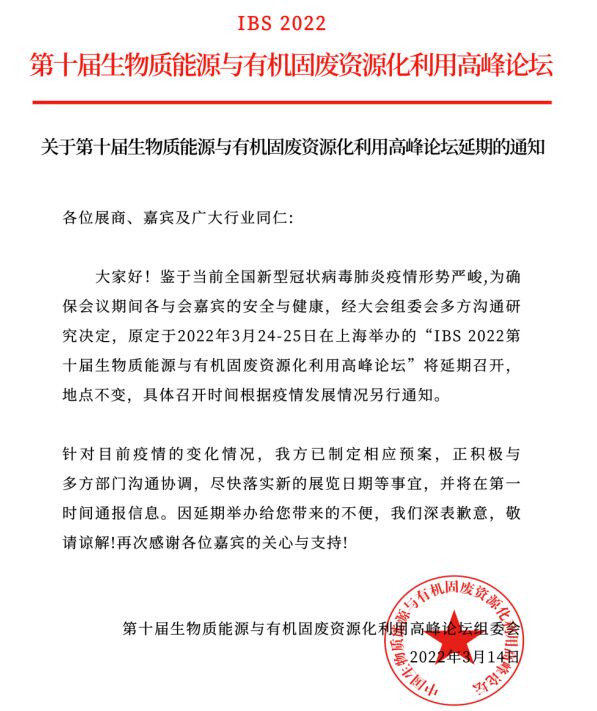 延期通知 |IBS 2022第十屆生物質(zhì)能源與有機(jī)固廢資源化利用高峰論壇