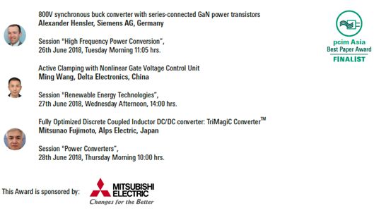 PCIM Asia 2018 國際研討會獎項入圍名單 研討會每年設(shè)立“最佳論文獎”和“青年工程師獎”兩大獎項,以表彰在電力電子行業(yè)的技術(shù)研究、市場趨勢預(yù)測及政策倡議上都有卓越貢獻之杰出人士。 最佳論文獎